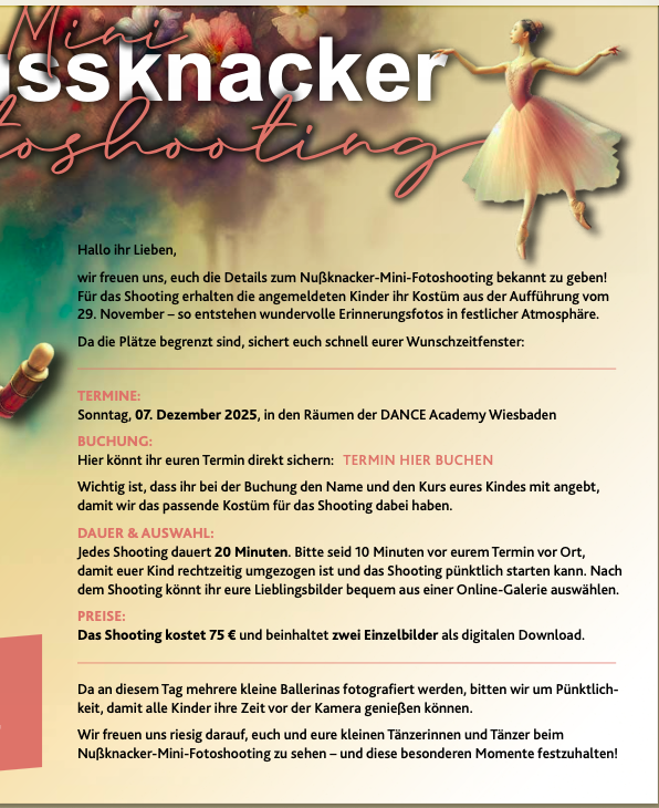 - Feierliche Übergabe der Prüfungszertifikate 2024Am Sonntag, den 16.03.2025 findet in der DANCE ACADEMY Wiesbaden eine besondere Feier statt: Die Schülerinnen und Schüler der DANCE…
